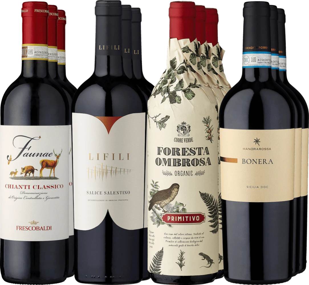 Der a6mani LiFili Salice Salentino zieht Sie mit seiner opulenten Frucht, den feinen Pfeffer- und Schokonoten sowie einem verführerisch weichen Schmelz in den Bann. Ganz im Süden des Landes, gedeihen auch die Primitivo-Trauben für den feinen, warmwürzigen und dezent süßlichen Cuore Verde Foresta Ombrosa. Etwas körperreicher, intensiver und perfekt zu herbstlichen und festlichen Gerichten schmeckt der aus Cabernet Franc und Nero d’Avola komponierte Mandrarossa Bonera. Und schließlich haben Sie mit dem Frescobaldi Faunae einen gut strukturierten Chianti Classico im Glas, der Ihnen den Charme der Toskana mit großer Eleganz ins Wohnzimmer bringt.