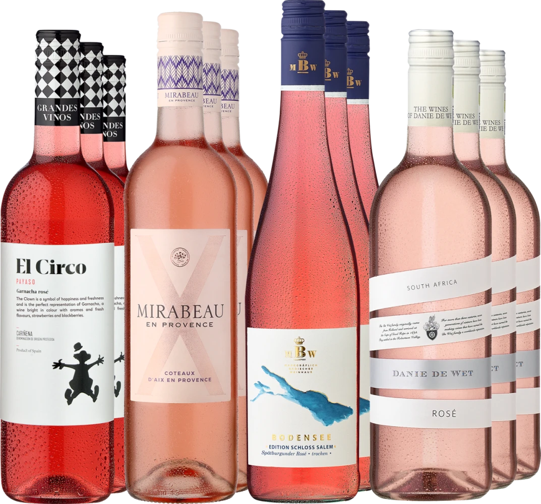 Die fruchtigen Aromen des MBW »Edition Schloss Salem« Rosés vom Bodensee machen ihn eisgekühlt zum perfekten Aperitif auf der Terrasse. Finesse und Eleganz– damit überzeugt der Mirabeau »X« Rosé. Dieser harmonische Roséwein aus der Provence ist der perfekte Begleiter zu leckerer Zucchini-Sommerpasta. Ausgelassen wie die spanische Lebensfreude ist der El Circo Rosado. Die zarten Himbeer- und Erdbeeraromen machen diesen Rosé aus Cariñena zu einem Sommerfavoriten! Herrlich fruchtig und einfach nur lecker ist der Danie de Wet »Good Hope« Rosé. Die perfekte Erfrischung an heißen Tagen oder ein unkomplizierter Begleiter einer jeden Grillparty!