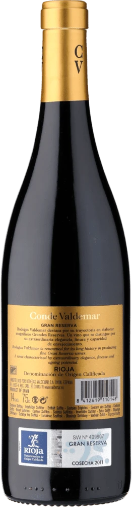 Dieser Gran Reserva der Conde Valdemar ist das beste Beispiel für die exzellente Arbeit der Weinmacher. Die Trauben stammen zu 100% von eigenen Weinbergen der Regionen Logroño, Ausejo und Oyón. Nach der Lese reift der Rotwein über 2 Jahre in Barrique-Fässern aus französischer und amerikanischer Eiche. Der Gran Reserva hat eine brillante, dunkle kirschrote Farbe gepaart mit komplexen Aromen reifer Früchte und Nuancen von Unterholz, Zeder, Trüffel und Gewürzen. Am Gaumen ist er wunderbar geschmeidig und schmackhaft. Besonders gut lässt sich der Rotwein mit spanischen Aufschnittplatten und gereiftem Käse genießen oder klassisch zu rotem, gegrilltem Fleisch.